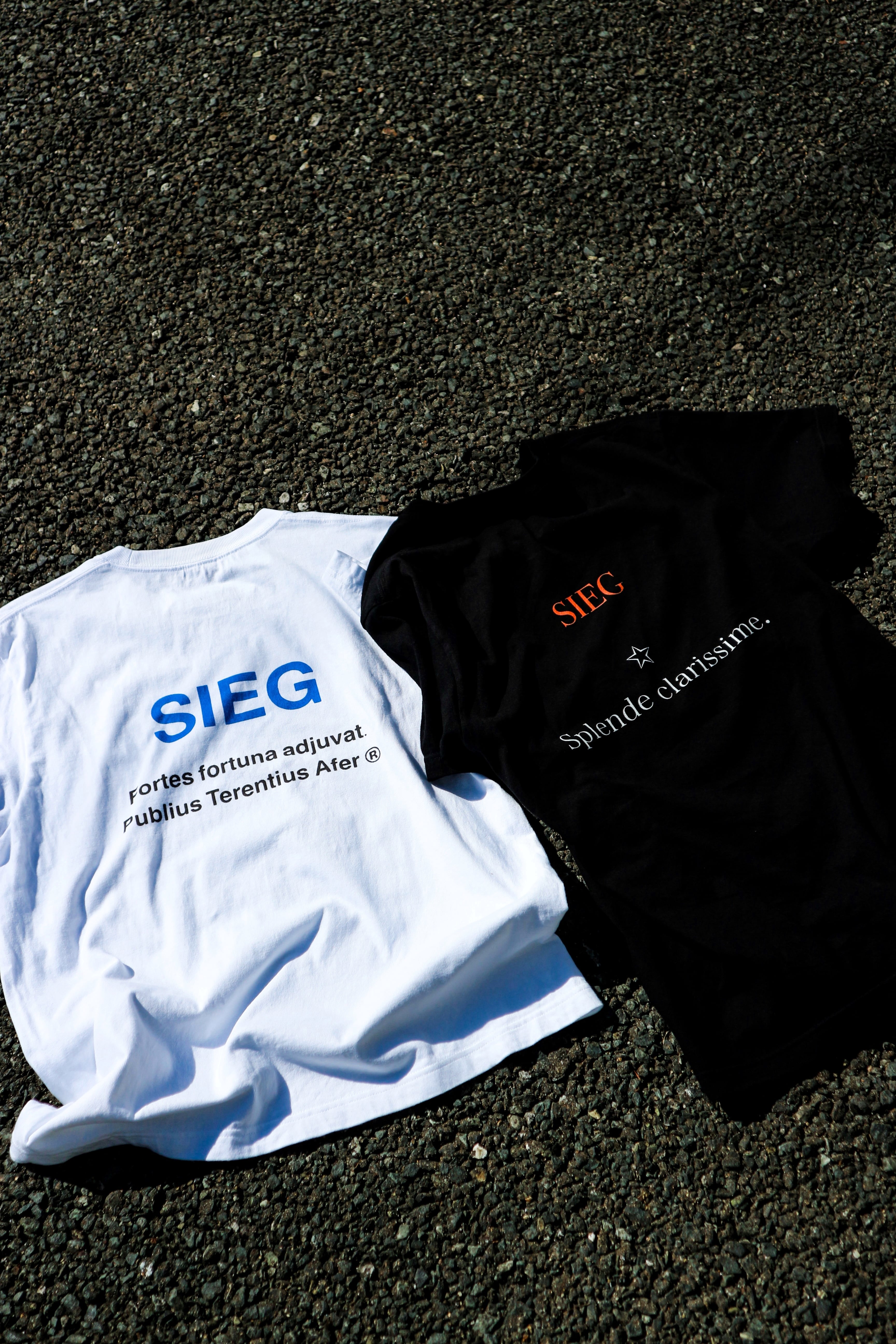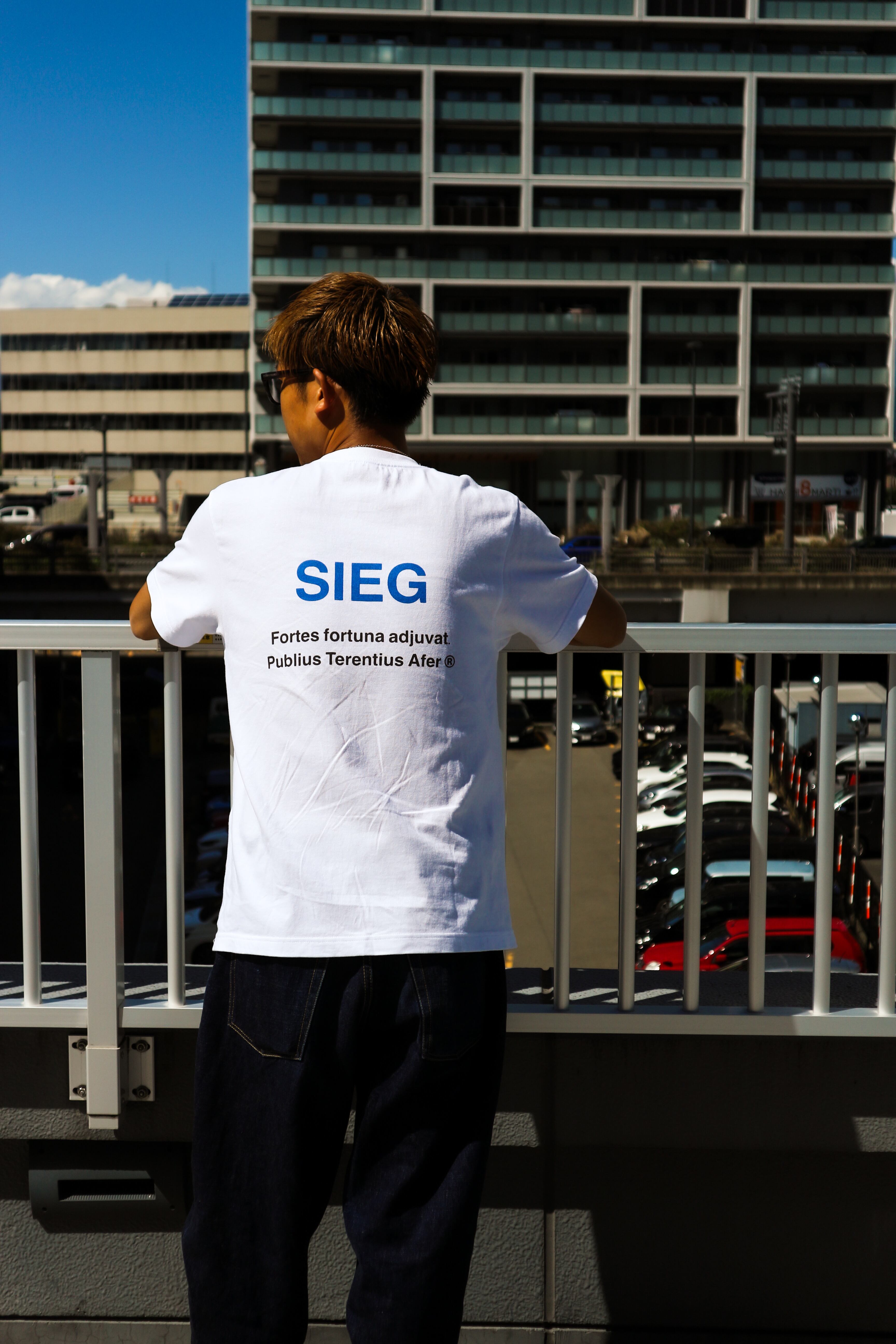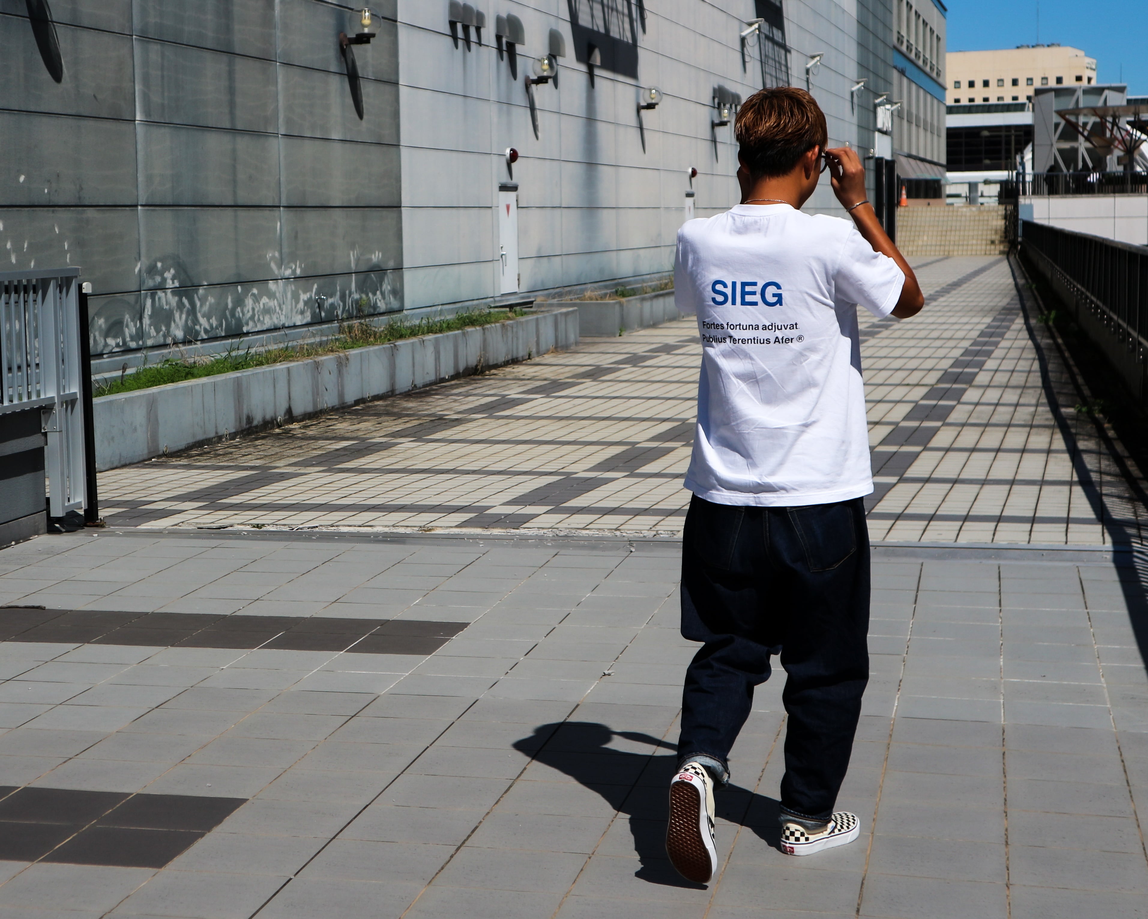 バックはSIEGのロゴと「Fortes fortuna adjuvat.(運命は勇敢者を助ける)」のメッセージグラフィックをあしらい、ブランドとして初となるインクジェット製法にて仕上げました。